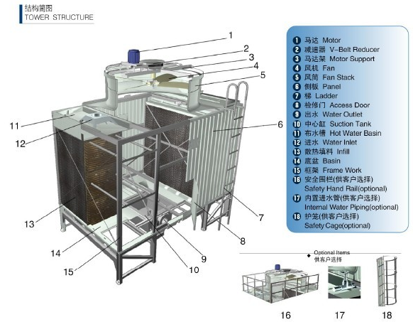 ◆ 产品概述 方形横流式冷却塔采用两侧进风,靠顶部的风机,使空气经由塔两侧的填料,与热水进行介质交换,湿热空气再排向塔外。填料采用两面有凸点的点波片,通过安装头使点波片粘结成整体,以提高刚性,两面的凸点还可避免直接滴水,因此提高了水膜形成能力,填料尾部设有收水措施。 冷却塔结构图 ◆ 风机装置 电机:配套电机为Y